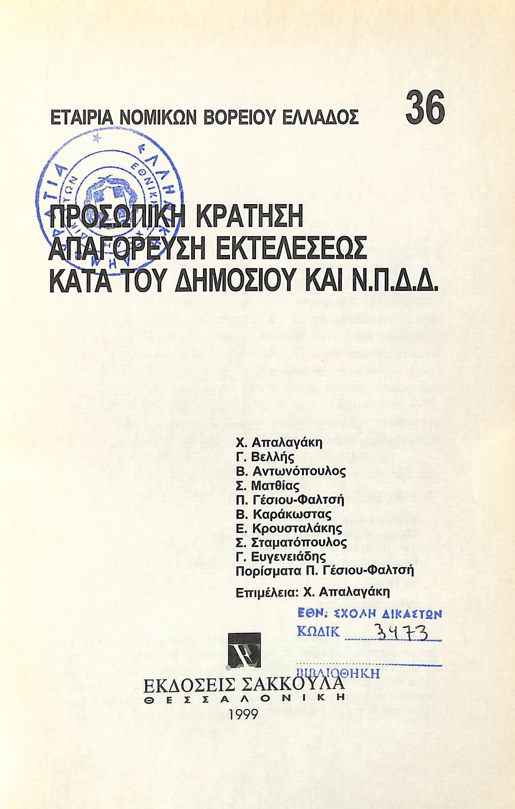 Τίτλος: ΠΡΟΣΩΠΙΚΗ ΚΡΑΤΗΣΗ ΑΠΑΓΟΡΕΥΣΗ ΕΚΤΕΛΕΣΕΩΣ ΚΑΤΑ ΤΟΥ ΔΗΜΟΣΙΟΥ ΚΑΙ Ν.Π.Δ.Δ.