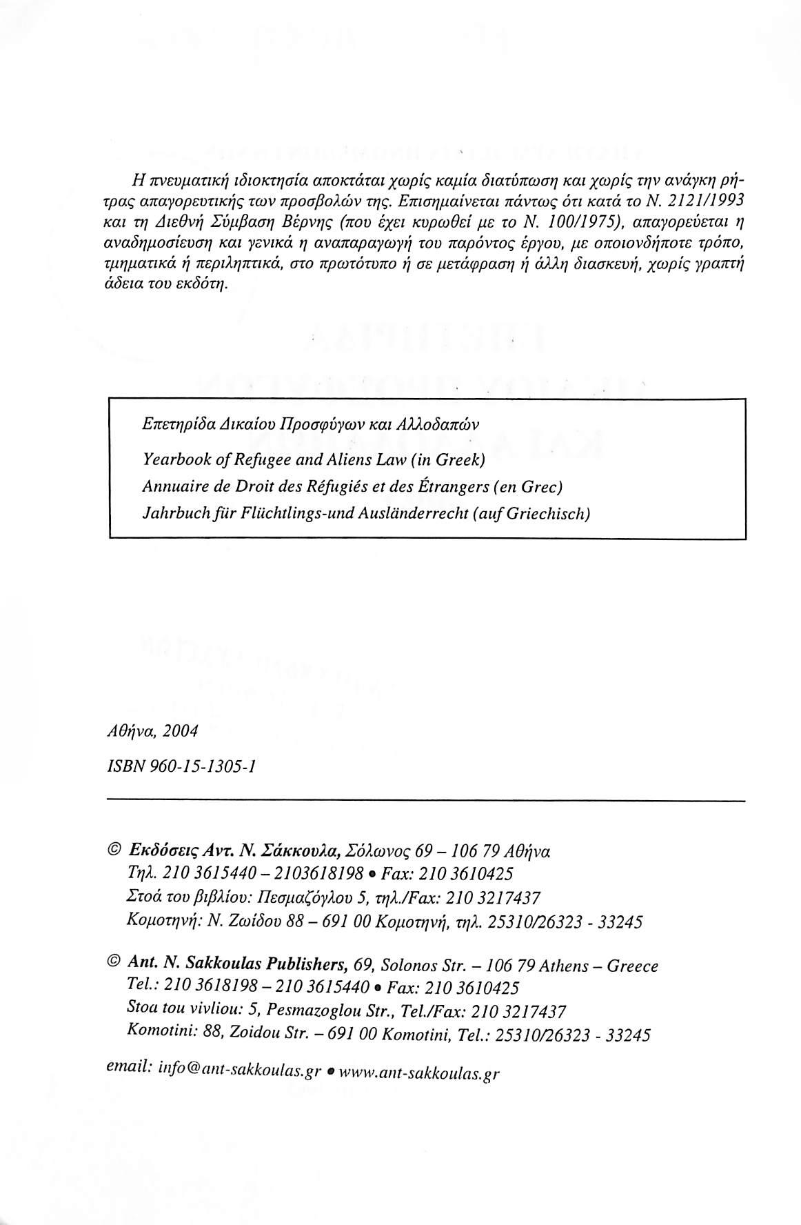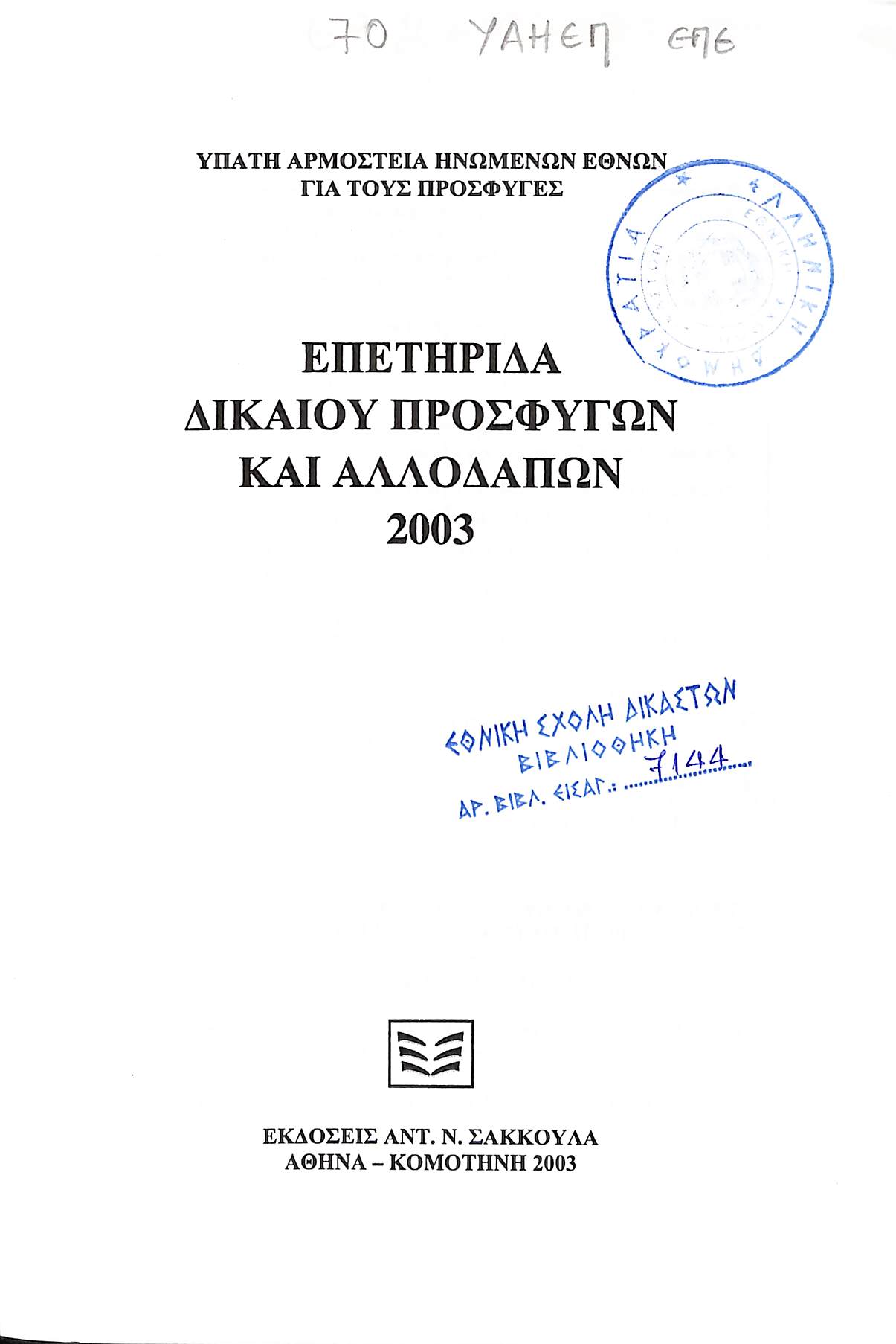 Τίτλος: ΕΠΕΤΗΡΙΔΑ ΔΙΚΑΙΟΥ ΠΡΟΣΦΥΓΩΝ & ΑΛΛΟΔΑΠΩΝ 2003