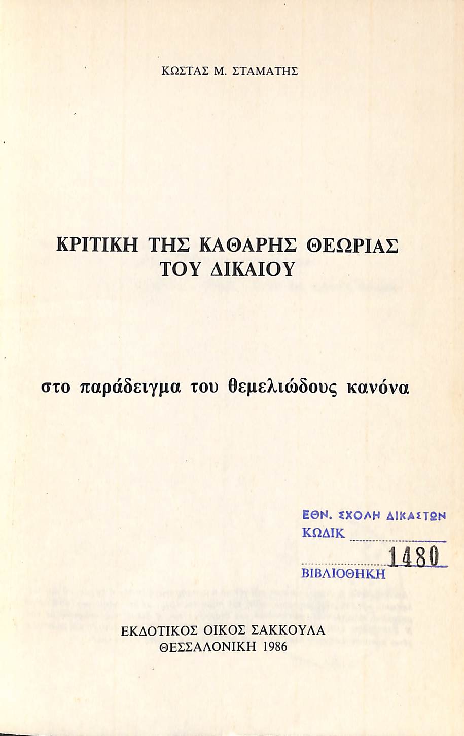 Τίτλος: ΚΡΙΤΙΚΗ ΤΗΣ ΚΑΘΑΡΗΣ ΘΕΩΡΙΑΣ ΤΟΥ ΔΙΚΑΙΟΥ