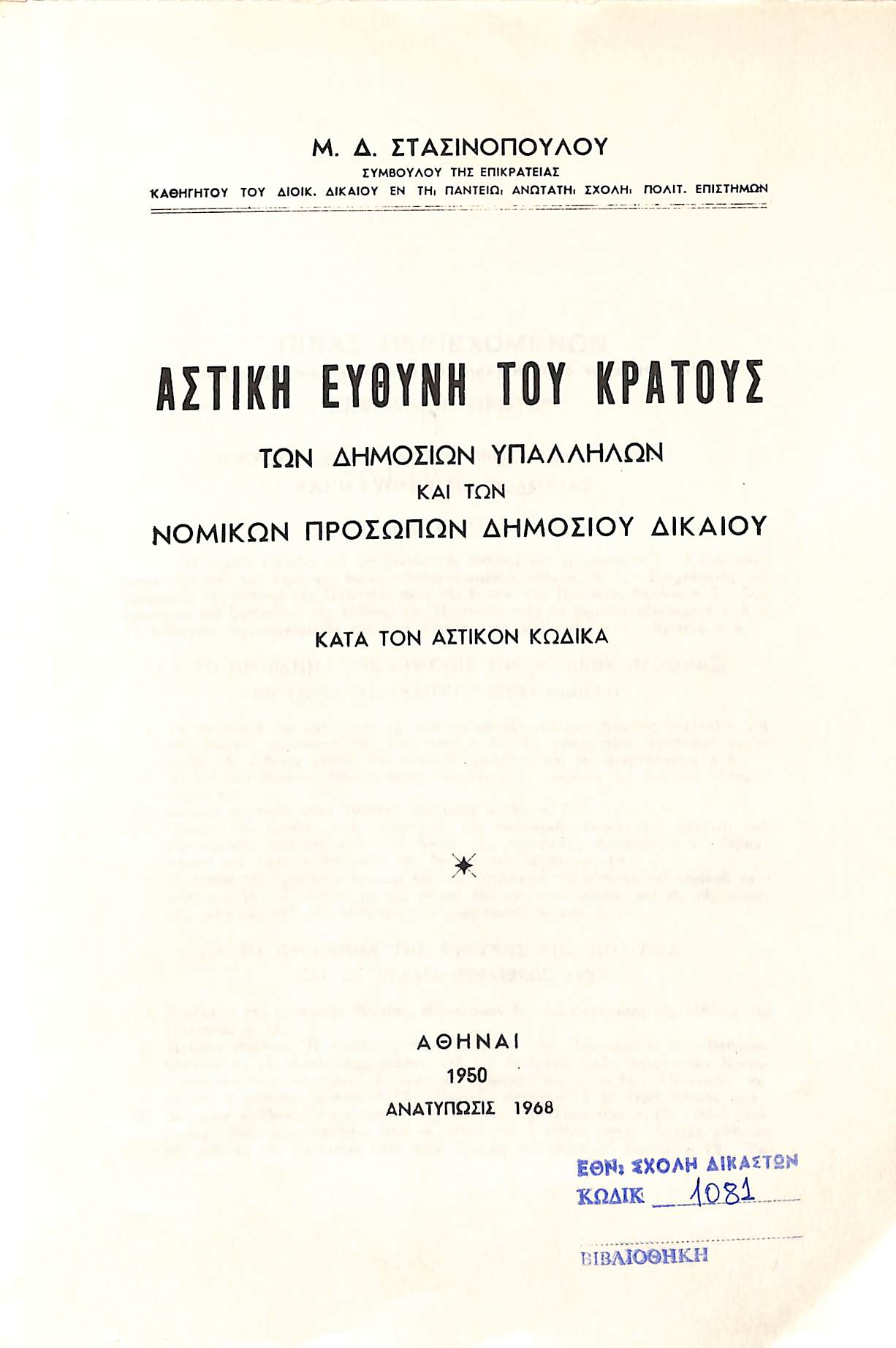 Τίτλος: ΑΣΤΙΚΗ ΕΥΘΥΝΗ ΤΟΥ ΚΡΑΤΟΥΣ ΤΩΝ ΔΗΜΟΣΙΩΝ ΥΠΑΛΛΗΛΩΝ ΚΑΙ ΤΩΝ ΝΟΜΙΚΩΝ ΠΡΟΣΩΠΩΝ ΔΗΜΟΣΙΟΥ ΔΙΚΑΙΟΥ